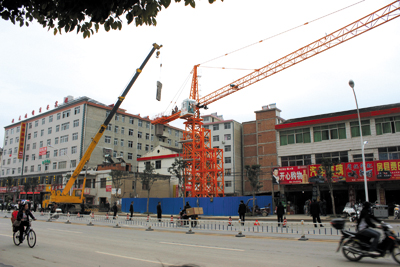 县执法局局长全权向记者介绍,如果要安装塔吊,必须向住建部门提交相关手续,待获得批准后,方可搭建。图为执法局工作人员正在拆除塔吊。 (闻燃 摄)