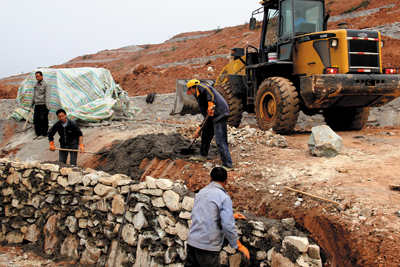 14日,记者在军店镇青沟水库水土保持工程施工现场看到,工人正在加紧施工作业。据悉,青沟水库是该镇低丘岗改造工程之一,项目计划改造总面积14565亩,其中坡地6554亩,占总面积的45%,荒山8014亩。该项目的实施,可以增加耕地面积,提高耕地质量,使土地集中连片,实现规模化经营,从而促进农村产业结构调整,带动地方经济的发展。 (杨鹏 摄)
