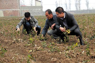 日前,记者在军店镇了解到,截至目前,该镇累计种植核桃9696亩(均为薄壳核桃),挂果面积2366亩,年产量达15.1吨,其中中村核桃示范园面积达5400亩,挂果面积1066亩,年产量达8.5吨。图为相关技术人员正在军店镇核桃育苗基地察看核桃幼苗生长状况。