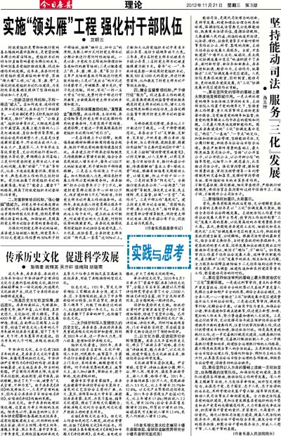 (肖玉玲)能动司法,是现代司法理念的创新,是科学发展、构建和谐社会理念的具体体现,强调法院或法官要充分发挥能动性,既要秉承法律价值,遵循法律规则,又要着眼人民利益,创造性地适用法律,从法律、理性、社情民意等多方面对案件事实作出公正、科学、客观的判断,主动为经济社会发展大局服务。当前,市委把建设“十堰市工业化、城镇化、农业现代化协调发展示范区”的旗帜授予了房县,面对新形势、新任务和新要求,房县要抢抓机遇、顺势而为,主动作为,统筹推进“三化”协调发展示范区建设。人民法院更要因地制宜,因时制宜,能动司法,更好地服务建设发展,为“三化”协调发展示范区建设作出贡献。