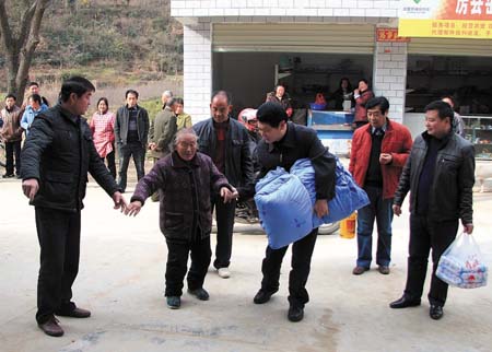 6日,县人民医院将20床过冬棉被、100升食用油、1000斤大米等价值12000元的物资,送到对口结对帮扶的窑淮乡东沟村贫困户和困难党员手中。同时,该院对东沟村进行了实地走访,确保帮扶项目保质保量地完成。图为该院党委书记、院长车向前为东沟村84岁的老党员张成云送去过冬物资。 (裴中东 摄)