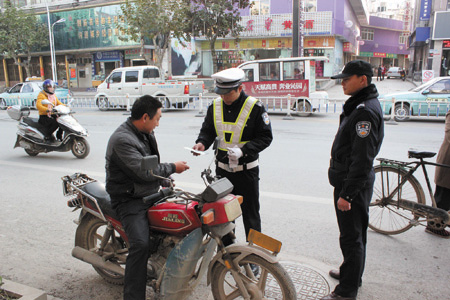 随着我县摩托车数量的与日俱增,交通事故频发,我县道路交通事故中67.7%与摩托车有关。图为县交警执法大队警员对未带安全头盔的摩托车车主进行处罚。 (刘臣 摄)