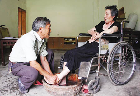 瘫痪之后,杜昌芝大小便失禁。刚开始为她清理时,张家成每次都会忍不住发呕,但呕吐完之后,他继续收拾干净。他每天的生活就是围着杜昌芝转,帮她穿衣、洗脸、梳头,抱着她坐到轮椅上,然后去厨房做饭。