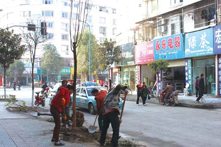 为营造良好的城市环境,7日,笔者在武当路路口看见,县住建局园林所工人正在对路边的绿化树进行补植。