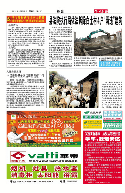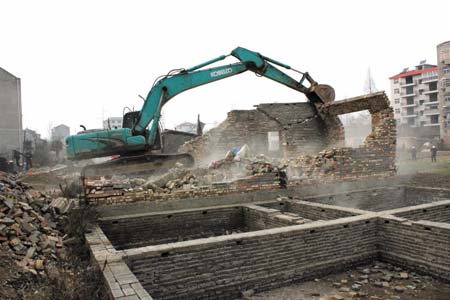 本报讯 (记者刘臣通讯员许满) 11日,县法院执法局对城关镇白土村八组的4户“两违”建筑进行了依法拆除,这是“两违”整治以来首次通过法院依法强制执行拆除的行动。