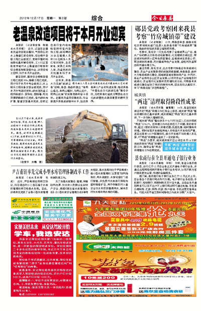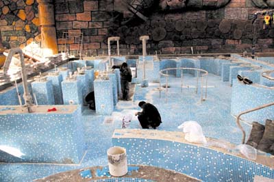 截至目前,温泉综合楼精装修工程已完成95%,隐蔽工程已完成,预计将于本月中旬全部完工;水上娱乐工程设备安装全部完成,预计本月中旬调试完毕;游泳馆改造工程拆除部分、装饰柱、图腾墙、阳光顶棚钢筋部分已完成,室内游泳池扩建、管道安装基本完成,目前正在进行室内泡池帖瓷砖和室内装饰工程;新招聘的30余名管理人员和230名服务人员已培训完毕,各类家电、家具已采购入库,改造完成的天悦温泉将于本月开业迎宾。