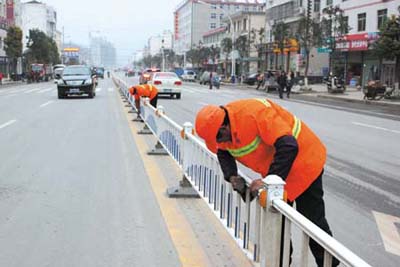 由于前几日的连续降雨,对护栏、垃圾桶造成了严重污染,县环卫所工人采用机械清刷和人工擦洗保洁相结合的方式进行了清理。截至目前,他们共出动70余名环卫工人,将城区内的所有护栏进行了一次全部擦洗。图为环卫工人正在房陵大道擦洗防护栏。 (闻燃 陈少华 摄)