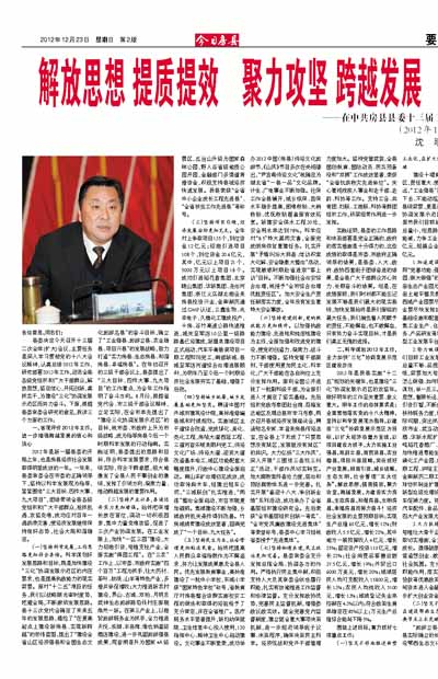 建设十堰南部生态工业新区,责任重大、使命光荣、任重道远,“工业强县”我们要永远坚持下去、不能动摇,这既是房县的县情需要,更是我们建设“三化”协调发展示范区的必然选择。虽然我们目前起点低、基础差、总量小,但思路不能变,决心不能减,力争工业总产值突破130亿元,规模企业增加值实现18亿元。