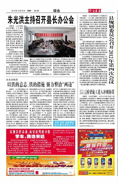 朱光洪在听取了相关意见后指出,《政府工作报告》中反映县政府今年工作成果时,要注重突出工作亮点,包括县政府今年在强化体制创新、解决民生问题、加快城市建设、扩大招商引资等工作中所取得的成绩;在安排部署明年的工作时,要坚持以打造十堰市“三化”协调发展示范区为目标,以扩大经济总量为主线,以项目建设为抓手,大力实施“工业强县,旅游立县,商贸活县”的发展战略。