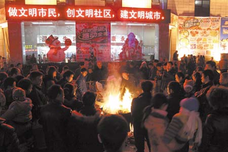 24日是一年一度的“平安夜”,记者在寿康永乐生活广场看到,商场四处张贴着圣诞老人的图片,摆放着圣诞树,挂满了各种彩球和装饰品。商家还为市民们精心准备了篝火晚会和各色促销活动,活动现场热闹非凡。图为寿康永乐生活广场篝火晚会现场。(刘臣 王丽君 摄)