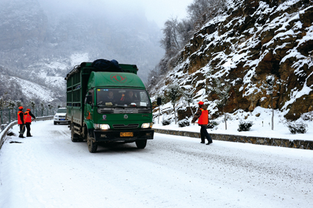 本报讯 (记者吴宏强通讯员邓青国 王东) 连日来,我县境内的降雪导致多条道路被冰雪覆盖,严重影响车辆通行。十房公路柳树垭路段积雪厚度已经超过5厘米。面对连续不断的雪情,交通人紧急动员,连日奋战在抗击冰雪保畅通一线,进行不间断巡查作业,坚持做到边下雪,边除雪,边维持通行。