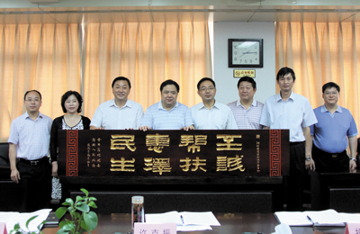 图为县委、县政府向省发改委赠送“至诚帮扶 惠泽民生”牌匾。