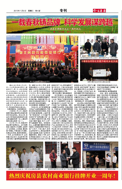1年前的1月10日,房县农商银行随全国信用社体制改革的步伐应运而生。成立以来,资金实力和贷款发放额始终位居全县金融机构第一位,上缴各项税收位居全县第一位……。