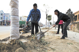 1月8日,房陵大道西延工程高碑4组段道路旁,工人为新补植的大香樟树浇水、培土、覆膜。为配合“三城联创”,县林业局调集100余株胸径20cm的香樟树进行补栽,大力营建道路生态林景观。针对今冬气温偏低,该局组织专班人用塑料薄膜、草绳对道路景观树树干进行包裹,为新栽植的道路景观树浇水保墒、覆膜保温,确保大树安全过冬。 (陈立煌 陈涛 摄)
