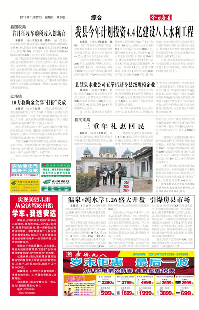 本报讯 (通讯员张启龙 张侠) 近日,笔者从县水利部门获悉,为认真贯彻落实十八大提出的加快水利建设要求,我县今年计划投资4.4亿元,建设八大民生水利工程。