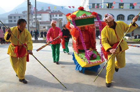 在城关镇县门街,花市日渐兴旺,红灯笼、鲜花、春联、挂饰等格外引人注目,吸引市民前来选购。在野人谷镇杜川村,艺术家们为村民们书写对联、作画,好一派热闹景象。在青峰镇,民间文艺爱好者组成的宣传队提前开始了彩排,划起旱船,扭起秧歌,为节日期间群众文化大餐“备酒备菜”。