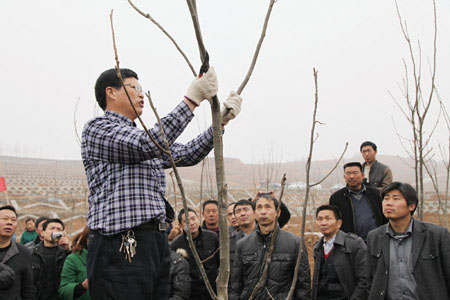 近年来,我县不断加快核桃产业发展,提升科学种植技术,仅2012年,我县新建核桃产业基地2.45万亩,采取施底肥、植大苗、高垄栽植、涂白,水、路、渠等配套措施新植核桃树80.85万株。据统计,全县现有核桃产业基地面积45.88万亩,挂果面积达13万亩,初步形成了核桃产业发展集群化。图为十堰市应用科技学校高级讲师马成占现场向林农传授核桃修剪、定干技术。 (陈立煌 摄)