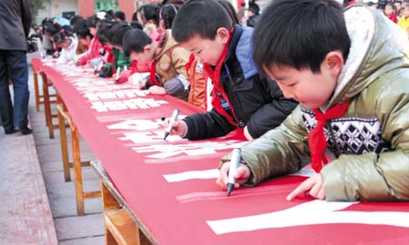 4日,县实验小学举行安全教育培训大会,宣传安全知识,组织学生在宣传横幅上签名(如图)。为营造安全、和谐的育人环境,该校近期对校园内外进行一次拉网式的安全大排查;主动与交警联系,加强对校门口的交通疏导;积极落实《校园安全管理办法》,确保每一位师生的人身和财产安全。 (辜超 唐自力 摄)