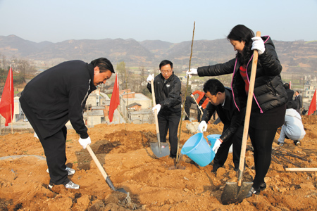 图为县委书记沈明云(左)、县长朱光洪(中)等县领导和县直机关干部一起在三海村参加义务植树活动