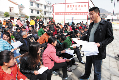 图为化龙堰镇古城村村民正在进行“十星级农户”交叉互评