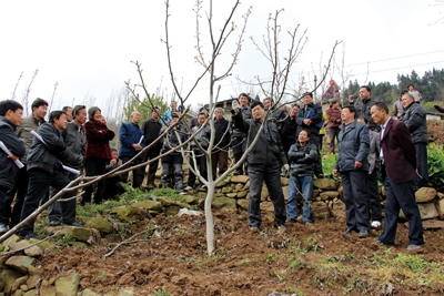 日前,姚坪乡50多名种植大户会聚在西坡核桃基地上,聚精会神地聆听市、县、乡林果专家讲解核桃树的春季管理技术。春耕备耕时节,该乡以村、组、户为单位开展科技培训活动,组织农业技术人员深入田间地头讲解果茶树修剪和田间管理知识,指导村民春耕生产。图为市林果专家马成赞正在向村民讲解核桃春管技术。(柯勇 黄治久 孙华斌 摄)