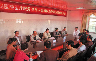 15日,县人民医院召开医疗服务收费中突出问题专项治理动员大会。要求全院职工积极行动,严格收费标准,强化质量意识,开展自查自纠、全面规范收费管理,杜绝违规收费行为,减轻患者医药费用负担,让病人放心就医,安心治疗。 (裴中东 摄)