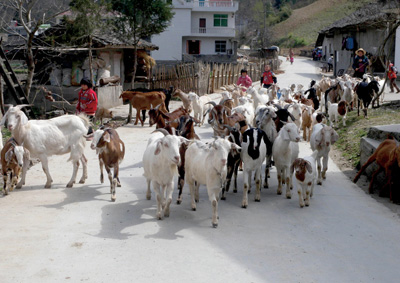 近年来,中坝乡制定出台优惠政策,鼓励农民大力发展山羊产业,截至2012年年底,全乡山饲养量达38000只,人均增收300元。图为中坝乡中坝村村民喻荣林正在将山羊赶往草场放牧。(刘忠义 摄)