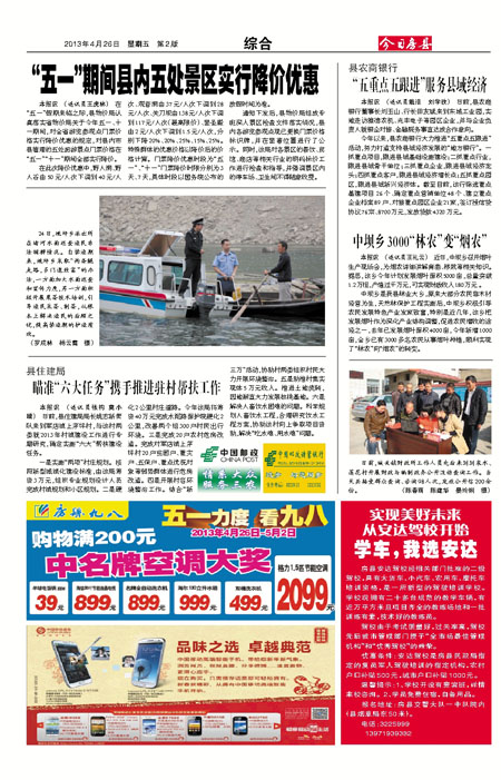 本报讯 (通讯员王虎林) 在“五一”假期来临之际,县物价局认真落实省物价局关于今年五一、十一期间,对全省游览参观点门票价格实行降价优惠的规定,对县内市县管理的五处旅游景点门票价格在“五一”“十一”期间全部实行降价。
