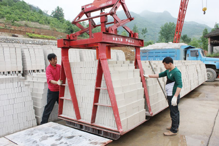 据悉,该材料具有高抗压、高抗折、重量轻、环保节能等特点。项目投产后年产量可达1亿块,实现年销售收入2100万元,新增就业岗位120个。图为工人们正在装箱新型墙体用砖。(刘臣 摄)