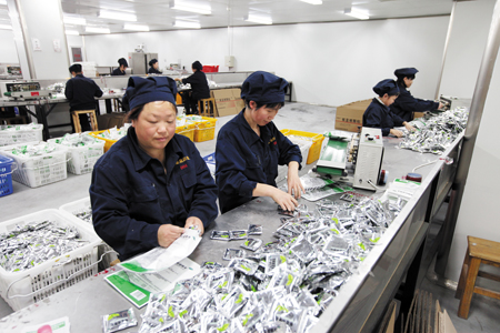 为完成全县各项经济指标“双过半”任务,县经信局积极引导企业保超目标。图为县金鼎制药公司包装车间工人正在加班加点生产。 (赵爱平 张立华 摄)