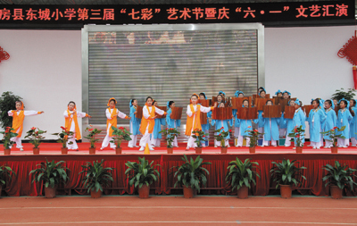5月30日,东城小学隆重举行第三届“七彩”艺术节暨“庆六一”文艺汇演。全校2600余名师生欢聚一堂,观看了以“红领巾相约中国梦”为主题的大合唱、舞蹈、小品、儿童情景剧、双簧、快板等18个节目。图为三年级学生表演的《读唐诗》节目。