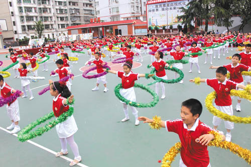 学校扎实开展“年级大课堂”、“大家跳、大家唱”、“阳光体育”等活动,解放学生的手脚,让学生真正享受童年的快乐。