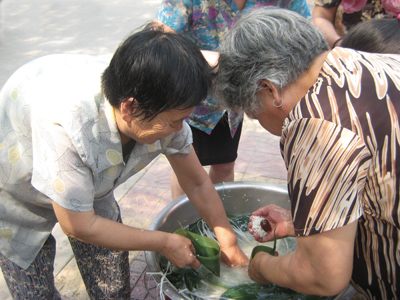 9日,东关社区刘大妈正在自家门前捆扎端午粽子(如图)。她告诉记者:“虽然现在什么东西都可以到超市里买到,但我还是愿意自己来做,这样过节才有意思,传统的东西不能丢呀!” (陈锐 摄)