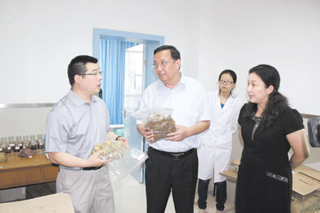 十堰市政协副主席、市卫生局局长黄剑云(左二)在房县中医院检查指导工作时强调,推广中医药适宜技术,提高大众身体健康水平是各级中医医院的神圣职责。