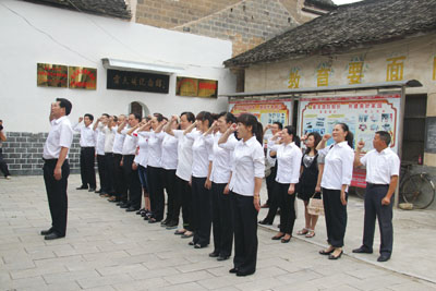 为庆祝建党92周年,26日,县文体局组织全系统党员干部参观雷天明纪念馆,缅怀革命先烈,重温入党誓词(如图)。近日,该局还举办了红歌比赛,表彰了一批先进党支部和优秀共产党员,激励党员干部进一步解放思想、开拓创新,为我县文体事业发展贡献力量。 (何琼 李丽 摄)
