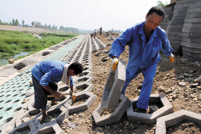 7月31日,县水利技术人员头顶烈日,衬砌城区三海段病险河堤护坡。连日来,县水利工程施工人员战胜持续高温天气,抢修重点病险河堤。截至目前,完成加固除险城乡河堤36.7公里,保护沿河两岸群众安全度汛11.3万人。(张启龙 摄)