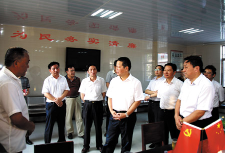 按照“设施配套、功能齐全、环境优美、管理有序”的要求,建设新型农村社区,让农民享受到市民化的服务。图为张昌尔、周霁一行在军店镇双柏村党员群众服务中心视察。