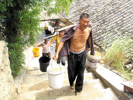 7月份以来,高温少雨,姚坪乡多处发生旱情。21日,笔者在该乡姚坪村看到:一群村民走好几里坡堵路,下堵河用桶挑水,解决生产、生活用水(如图),像西坡村这样的村子,全乡有8个。据了解,该党委政府不等不靠,已采取多项措施及时为老百姓寻找水源,同时希望相关关部门能够从物资、资金、技术上给予大力支持,解决村组人畜饮水困难,确保一方平安。(柯勇 罗成林 肖春琴 摄)