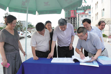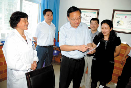 图为十堰市政协副主席、市卫生局局长黄剑云(左三)在我院检查处方的情景。