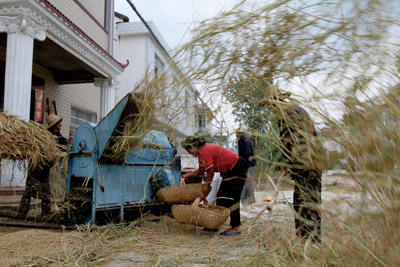 6日,红塔镇塘溪村农民在脱粒水稻(如图)。今年,由于对旱灾、虫灾等自然灾害的科学应对,全县12.5万亩水稻实现丰收。目前,全县20个乡镇农民正在抢晴天,战雨天,确保稻谷颗粒归仓。(张启龙 摄)