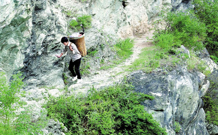 沿着悬崖峭壁,伍昌云把新书背回学校。