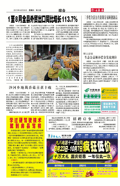 本报讯 (通讯员胡林忠) 据海关数据显示,今年1至8月我县外贸出口总额3773.4万美元,居全市首位,比去年同期1765.9万美元增长113.7%,增幅在五县一市三区中位居第三位,连续四个月大幅回升。其中,以香菇、木耳、山野菜等为主的农产品出口总额3169.2万美元,占全县出口总量的84%,比同期986.6万美元增长221.2%,总量和增幅均居全市第一。