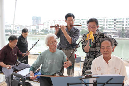 1日,记者在西河广场看到,市民聚集在这里吹拉弹唱,自发参与到丰富多彩的文体活动中,共同分享祖国繁荣发展建设成果, 庆祝祖国第64个生日。 (雷洁 摄)