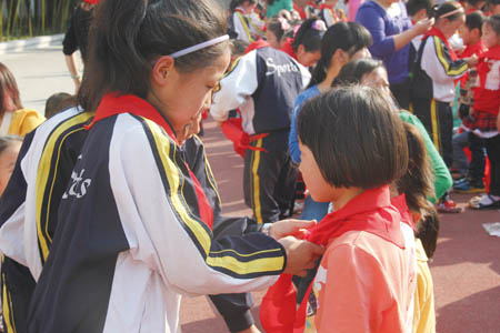 10日,在中国少年先锋队建队64周年到来之际,县实验小学举行“红领巾相约中国梦”新队员入队仪式。活动中,200多名一年级优秀学生加入了少先队。图为老队员为新入队的学生佩戴红领巾。 (雷洁 辜超 唐自力 摄)