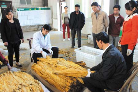近日,上龛乡的烟农正在烟站交售烤烟(如图)。据了解,今年上龛乡种植烤烟5750亩。受遭受灾害性天气影响,产量比预计有所下降,在该乡党委政府及烟草部门的及时帮扶指导下,灾害损失被降到最低。今年全乡烟叶收购计划1.34万担,预计可收购烟叶1.5万担以上。 (刘丹 摄)