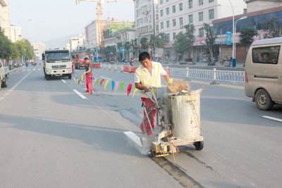 近日,记者在城区主干道看到,许多路口的人行横道都被粉刷一新。据了解,由县交警大队组织进行的道路交通标识维护工程正在紧张进行,将对城区神农路、武当路、房陵大道等多条主干道的交通标示牌、道路标线、防撞桶等设施进行系统维护、更新。图为工人正在铺设道路标识线。