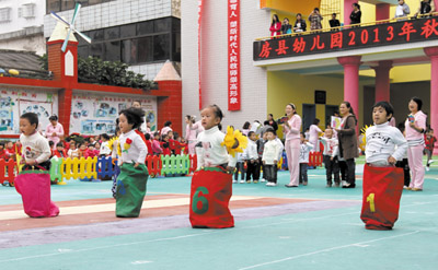 18日,县幼儿园秋季运动会拉开帷幕,来自该园的荔枝班、桔子班等24个班800多名学生参加了运动会。县幼儿园举办跨栏小飞人、车轮滚滚等12个项目的秋季运动会,旨在锻炼学生的身体,增强动手、动脑的技能,提高学生相互配合、互相协作的能力,让小朋友们快乐健康的成长。图为运动会袋鼠跳接力赛现场。