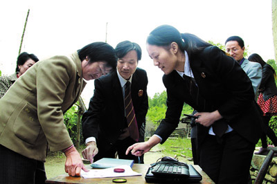 图为“家事法庭”在王老太家开庭时,老人儿女在调解协议上按手印。