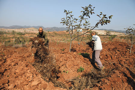 24日,军店镇清沟核桃基地里农民正在给核桃树施农家肥。我县核桃基地2012年列入中央财政现代农业生产发展资金核桃基地建设项目,涉及竹房城镇带房县片区的城关、白鹤、红塔、军店、化龙堰5个乡镇14个行政村,一期建设规模8000亩。为加强核桃秋季田管,我县采用环状施肥方法,距树0.6米开挖施肥槽,施肥以农家肥为主,辅以核桃专用肥,确保核桃树安全越冬。