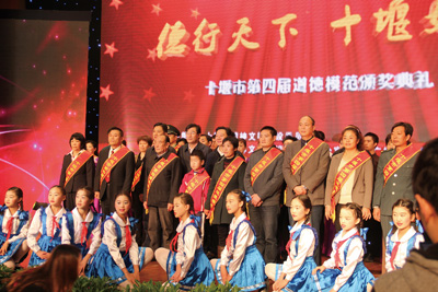 1日,由市文明委主办,主题为“德行天下·十堰好人”的第四届道德模范颁奖晚会在湖北职院会议中心隆重举行。我县推荐的伍昌云、龚庆平荣获全市“十大道德模范”。图为市领导与道德模范合影。 (刘臣 任志勇 摄)